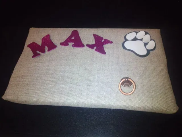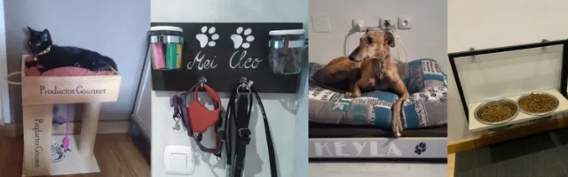 Este usuario creó un original portacorreas para su mascota combinando madera, telas decorativas y detalles hechos a mano. Añadió pomos como colgadores y pequeños recipientes para guardar chuches o bolsas, todo personalizado con nombres y adornos en forma de hueso o huella. El resultado: un accesorio práctico, bonito y hecho con mucho cariño.