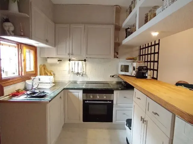 7-) Reforma de cocina con pintura. vinilo autoadhesivo y otros elementos Sonia Expósito nos mostró en este Proyecto cómo transformar su cocina con sencillos pasos y sin obras. Aunque la reforma incluyó cubrir los azulejos con vinilo autoadhesivo y decapar la encimera, el cambio de color en las puertas y muebles fue clave para lograr un acabado fresco y renovado.