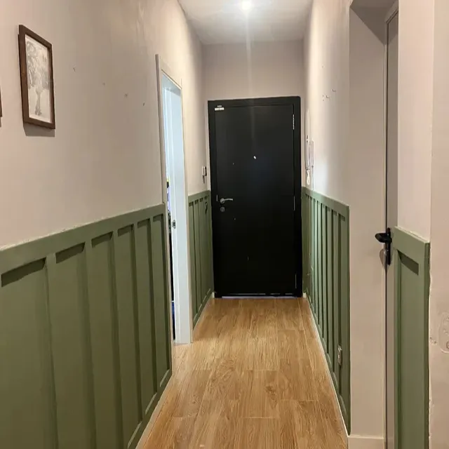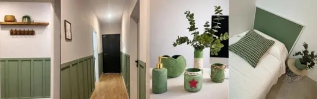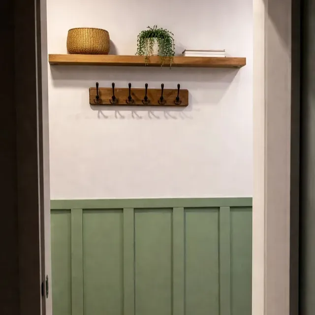 Para reforzar el protagonismo del color, incorporó unas baldas a medida y las pintó combinando un gris neutro en la parte superior con BALI 2 en el resto de la composición. De este modo, el verde no solo aporta color, sino que organiza visualmente la entrada y conecta todos los elementos.