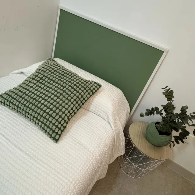 La intervención más destacada es un cabecero realizado a medida en pladur y pintado en este verde sereno, que organiza visualmente todo el dormitorio. Para asegurar un buen resultado a largo plazo, los cantos se remataron con perfil de PVC, consiguiendo un acabado limpio, resistente y muy cuidado.