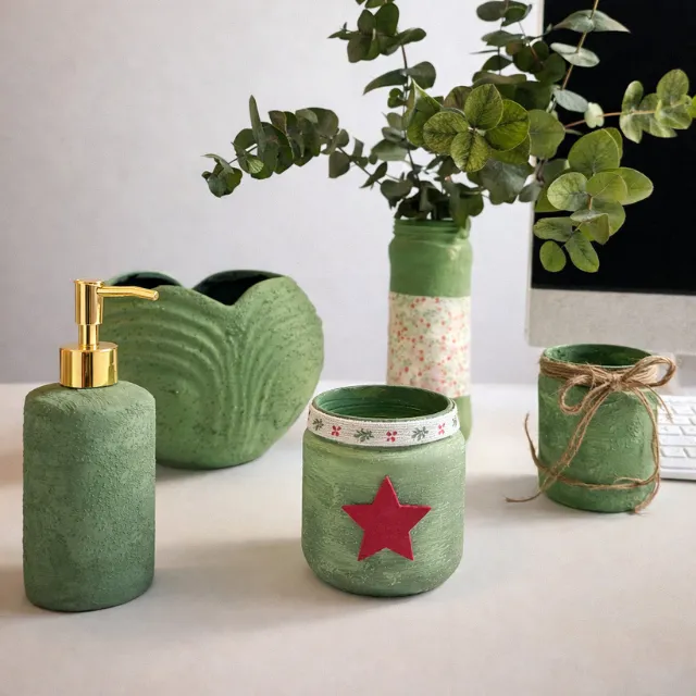 Botes de cristal, una jabonera pasada de moda y un jarrón muy deteriorado se transforman en nuevos elementos decorativos que ahora encajan entre sí y con el resto de la estancia.