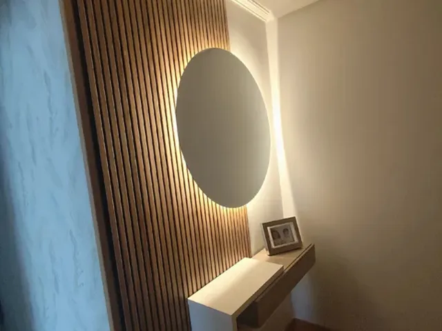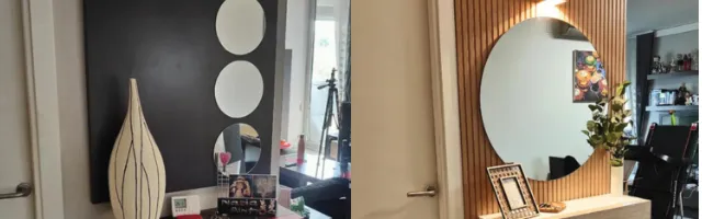 @Zurinezla renovó y modernizó por completo el recibidor incorporando palillería solo en la mitad de la pared, centrando en ella un espejo redondo. Al iluminarlo con luces LED, consiguió un efecto de halo que le da un toque mágico y único al espacio. ¿Te gustaría probar este efecto en tu recibidor? Ve cómo lo hizo, visita su Proyecto.