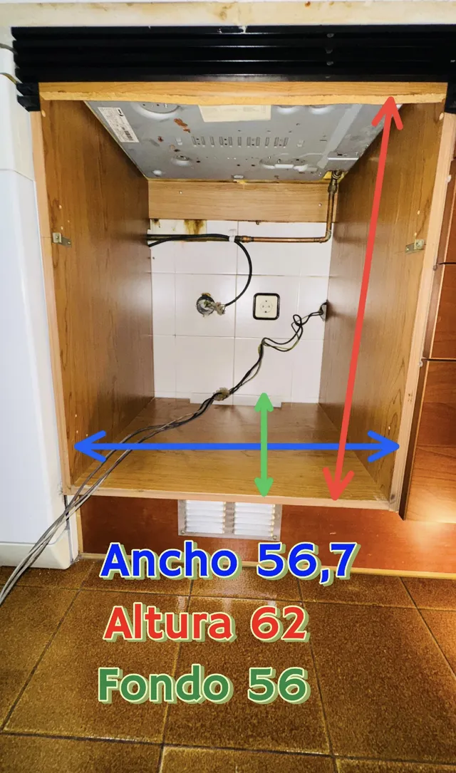 Como se ve en la foto del hueco, próximo a la pared existe un tubo de gas que va a la Placa de gas y está a una altura de 51 cm. O sea el tubo quedaría separado del horno 6,2 cm.(51-44,8) en vertical.