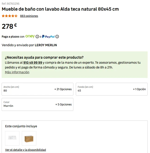 Además, tal y como indica @Bricolador1858326, tenemos otros modelos que tienen dos referencias asociadas, una sin lavabo y otra con lavabo. Si el mueble viene con el lavabo incluido directamente del fabricante no habrá un lote como tal y no verás que el pack se divide a su vez en dos productos (mueble + lavabo). Si el pack o lote del mueble y el lavabo lo hemos hecho nosotros, podrás ver el desglose de los dos productos antes de realizar la compra.