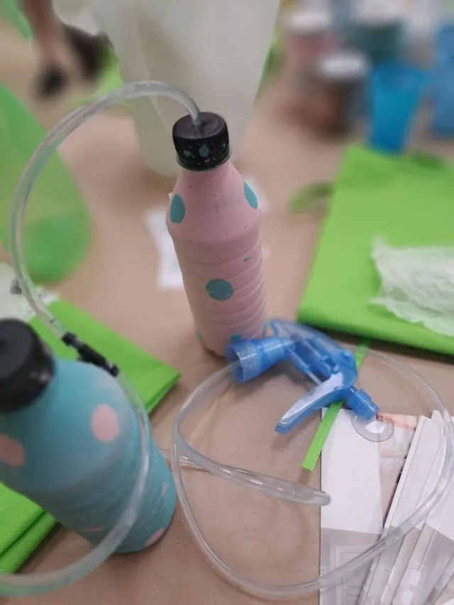 Seguidamente hacemos un agujero al tapón de cada botella y las pintamos con pintura a la tiza como más nos guste. Una vez pintada y secada la pintura, metemos la manguera por el tapón de cada botella , de tal forma que queda unida al pulverizador.