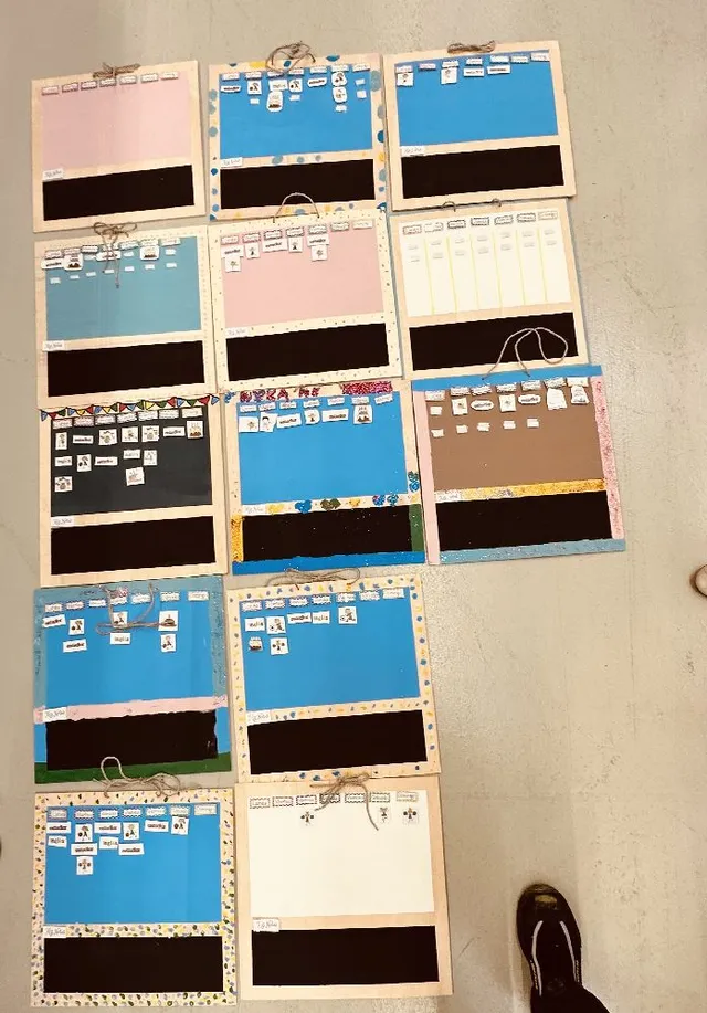 Una vez tuvímos todo cortado y el calendario seco, fuímos poniendo velcro de pegar a cada día de la semana y a las extraecolares y lo fuímos organizando.