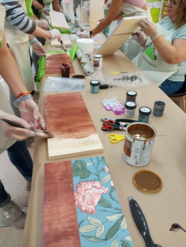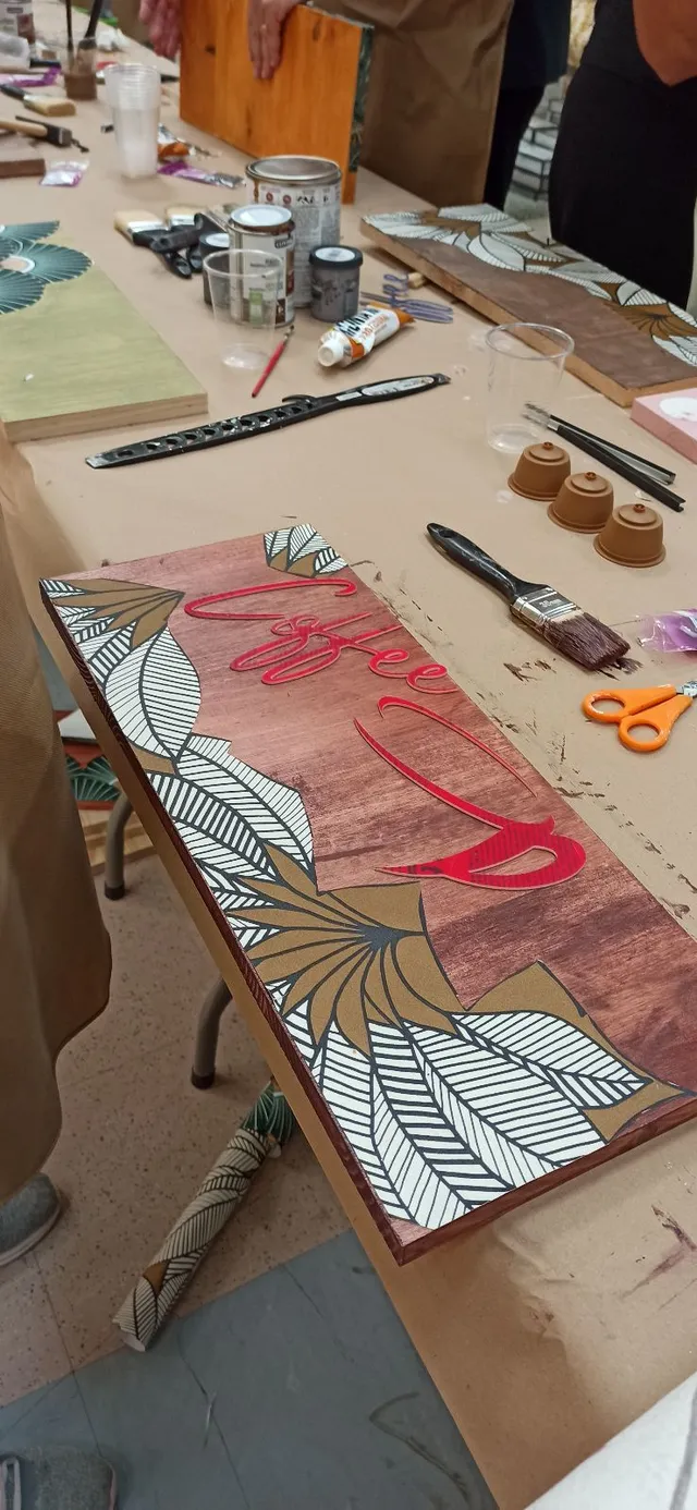 Para empezar, cada uno pintó o barnizó el tablero a su gusto. Una vez seco, le pusimos con cola el papel pintado que eligió cada uno. Con letras impresas en 3D le pusimos el letrero "Coffee". Y finalmente le pusimos unas alcayatas para colgar las tacitas de café.