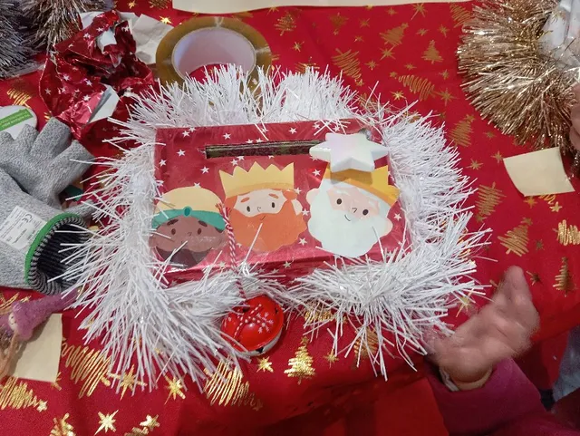Llegados a este punto sólo nos queda decorar nuestro buzón como más nos guste con cinta de doble cara o precinto y espumillones, bolitas, piñas. copitos de nieve, lazos, etc. En nuestro caso además le pusimos imágenes de sus magestades de oriente.