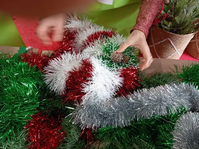 Ya pegadas procedemos a forrar el bastón de cartón con los trozos de espumillón que fijaremos con la ayuda de pequeños puntos de silicona caliente hasta rodearlo entero.