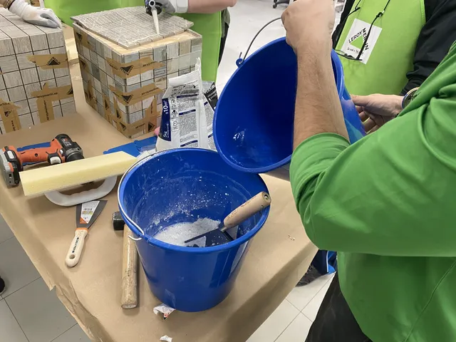 5- Crea la pasta para las juntas: Coge un cubo en el que se echará el mortero combinándolo con agua, hasta que nos quede una textura sin grumos.