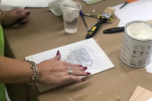 Paso 3. Para realizar el transfer es muy importante contar con una imagen de buena calidad para obtener un buen resultado. Te recomendamos que la fotocopia se realice con impresora láser y si tiene texto como en este caso tenemos que invertir la imagen. Se aplica el producto Foto-Transfer por la parte donde aparece la imagen, con una brocha suave, repartiendo uniformemente y de forma generosa. Se coloca la imagen donde se desee y se presiona suavemente siempre desde el centro hacia los bordes para que quede bien pegada y sin bolsa de aire (se puede usar una tarjeta como las de crédito para presionar).