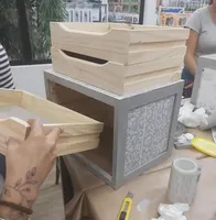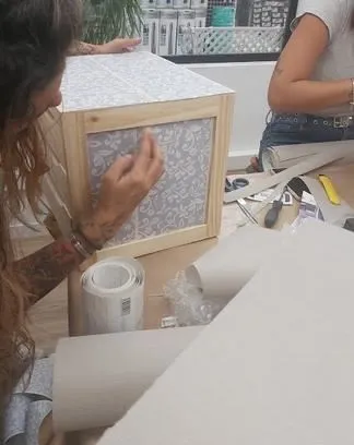 Utilizamos una cajonera de madera con 3 cajones, se pinto y se utilizo papel pintado, como toque final pusimos tiradores muy originales con un toque moderno.