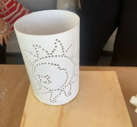A partir de este momento, se trata de montar la lámpara. Podéis simplemente pegar sobre el taco de madera el tubo decorado, para colocar dentro una vela, a modo de portavelas, o bien colocar un portalámparas.