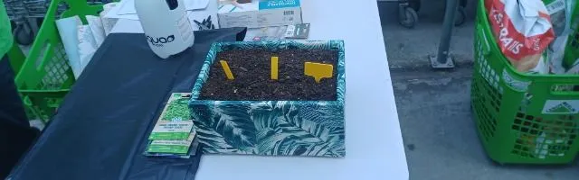 Por último para que nuestras plantas crezcan con fuerza hemos colocado en la tierra un poco de abono y agua, y como no queremos olvidarnos de lo que hemos plantado usaremos las placas para escribir el nombre de los cultivos y así tenemos listo nuestro mini huerto para llevarlo a casa.
