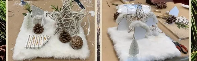 Recortando un viejo rodapie y reutilizando diferentes objetos que tengamos por casa se pueden crear maravillosas decoraciones navideñas como las que han creado en nuestro taller.