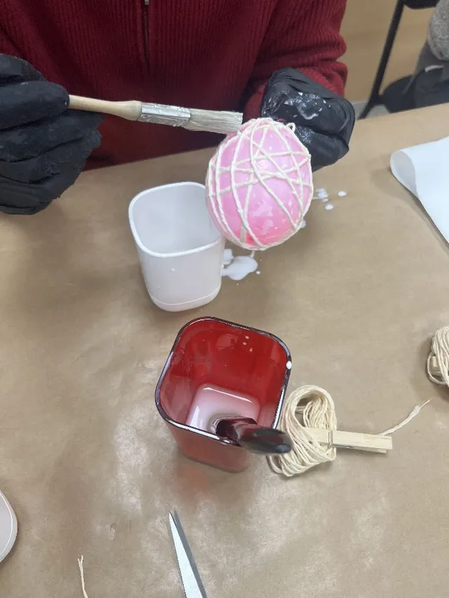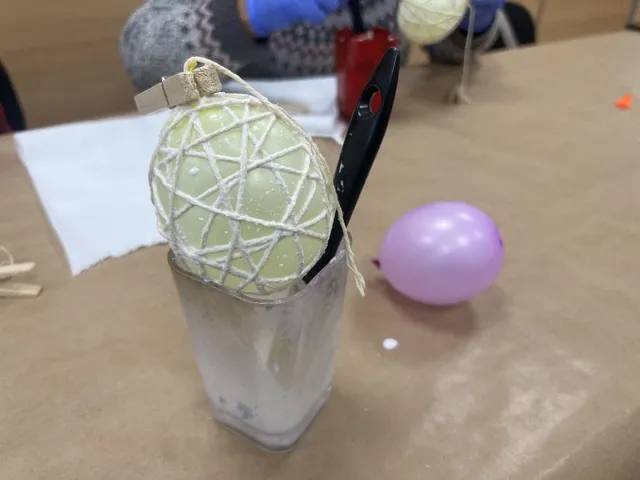 Explota el globo. Luego de que hayan pasado 24 horas comprueba que el hilo está seco y que se ha formado el cuerpo duro de una bola. Explota el globo y quítalo con cuidado de no romper la bola.