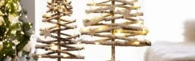 Cogemos cañas de distintos tamaños y hacemos una escalera con la cuerda, colocamos las luces y lo adornamos a nuestro gustro.