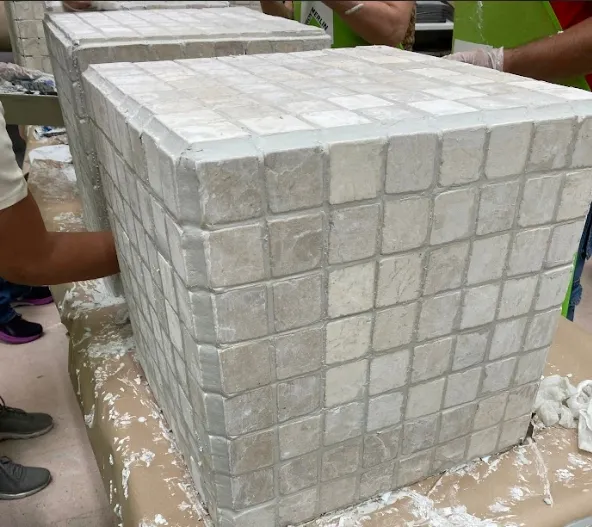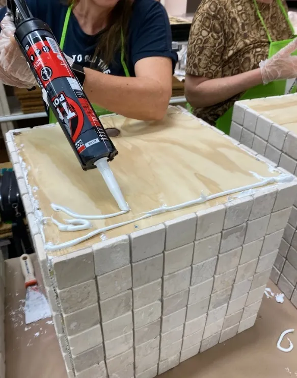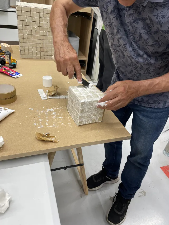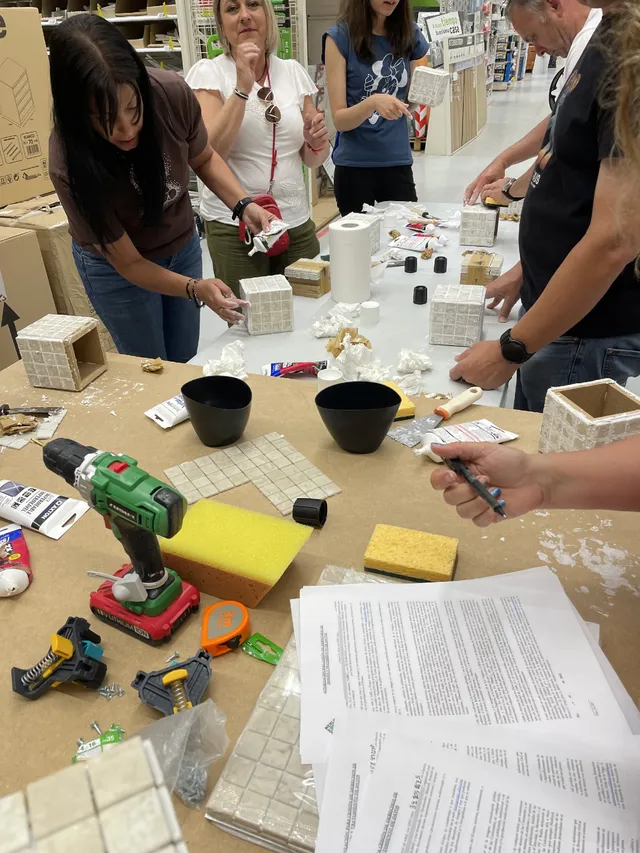 Durante el taller, los asistentes ensamblaron una estructura de madera desde cero, aplicaron adhesivo especial y colocaron azulejos decorativos (gresite), consiguiendo un acabado resistente, elegante y muy personalizado. ¡Un proyecto práctico, creativo y muy decorativo!