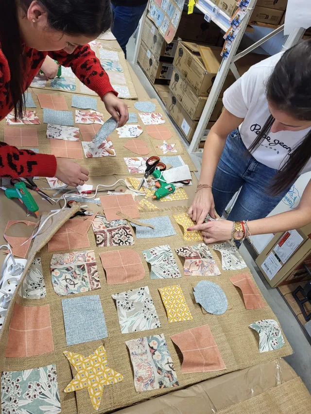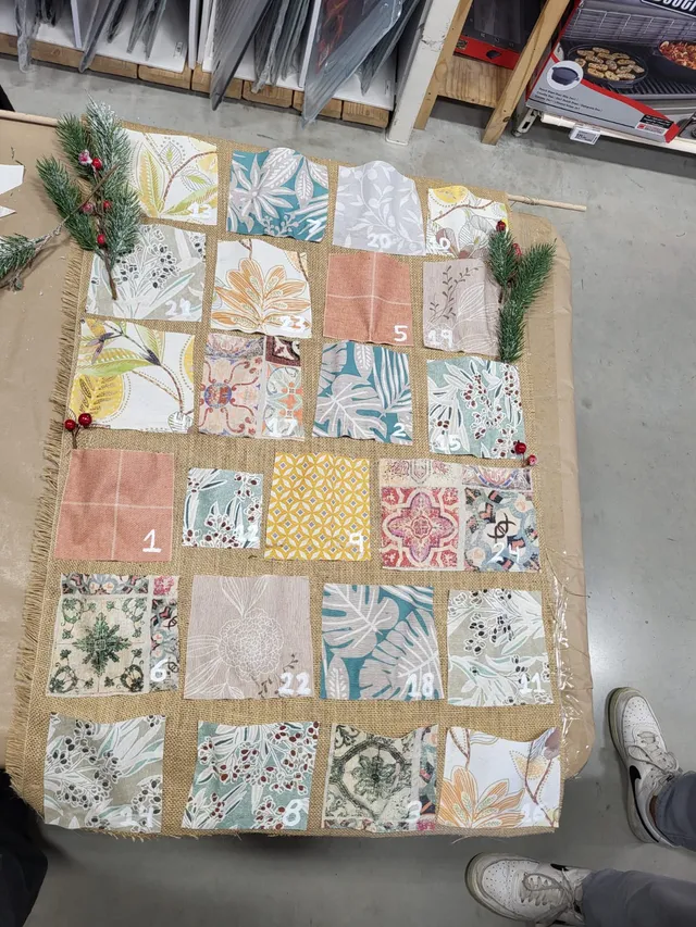 Este taller consta de hacer un calendario adviento con materiales reciclados , en este caso, retales de telas y manteles.