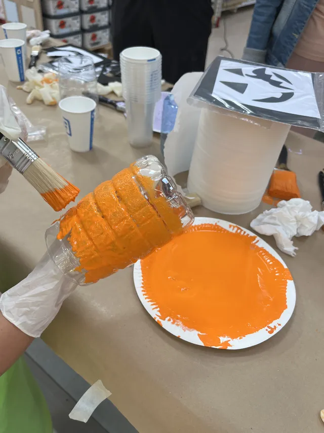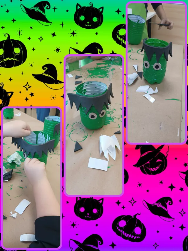 En primer lugar recortamos una botellas y utilizamos la parte inferior, la cual pintamos de color verde (se puede pintar del color deseado creando calabazas, fantasmas o monstruo deseado).