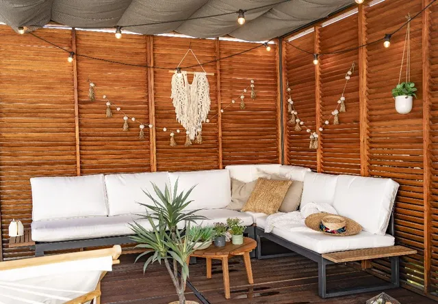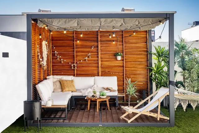 Para aclimatar la pérgola, nuestra protagonista compró en su tienda Leroy Merlin de confianza el panel sándwich, el barniz de teca y las telas decorativas que son repelentes del agua.