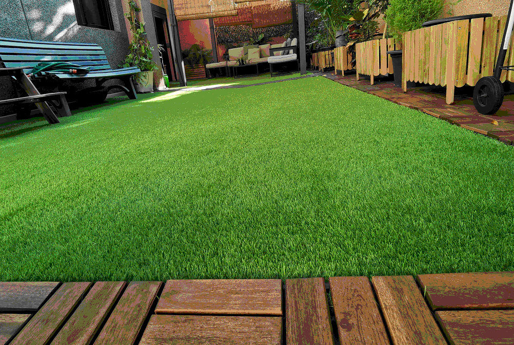 Acondicionamiento con césped artificial, losetas de madera, seto de ocultación, pérgola y conjunto de jardín.