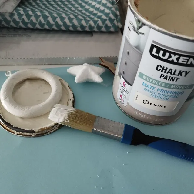 Materiales que vamos a necesitar: aro, trapillo, cinta o macramé, chalk paint, brocha, cola, pistola de silicona, tela para el lazo, diecut o adorno navideño.