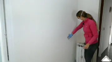 Limpiamos la pared con agua y pasamos a la masilla lista al uso para alisar gotelé de grano medio, la primera mano que le demos debe ser un poco más gruesa, de relleno, que no se marque el gotelé. Cargamos la llana y hacemos todas las paredes, una vez listas, dejamos secar por completo. ¡El tiempo de secado dependerá sobre todo de la temperatura de la casa!