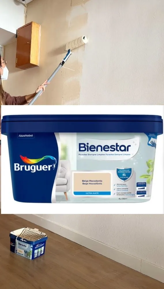 2º) Como quería el friso en blanco, he pintado la pared de arriba en este beige macadamia para dar calidez a la estancia.