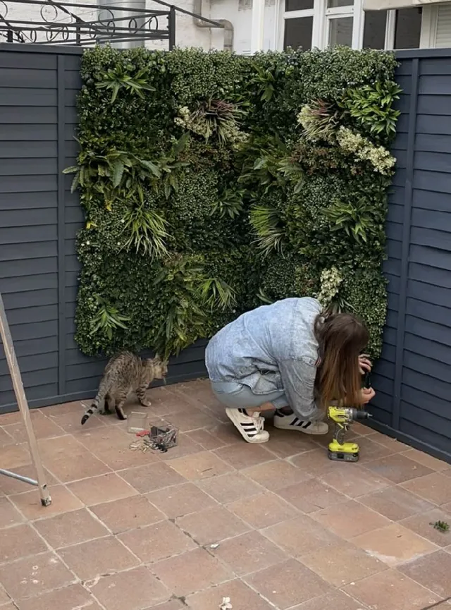 Una vez seca toda la pintura, es el turno de decorar un poquito la zona del panel, asi que para ello se ha puesto en la zona de la esquina unas planchas de jardin vertical artificial para crear un rincon muy acogedor.