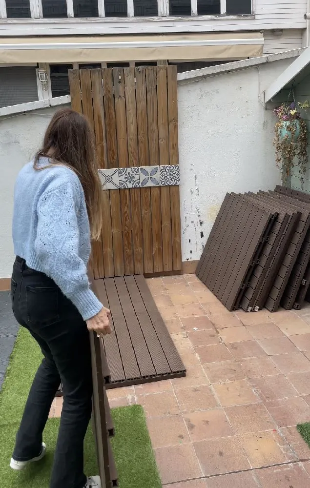 para diferenciar el suelo de la zona donde ira la ducha solar, he incorporado un suelo de baldosa de 90 x 90 cm de composite, que es un material que aguanta fenomenal a la intemperie y no requiere tratamiento.