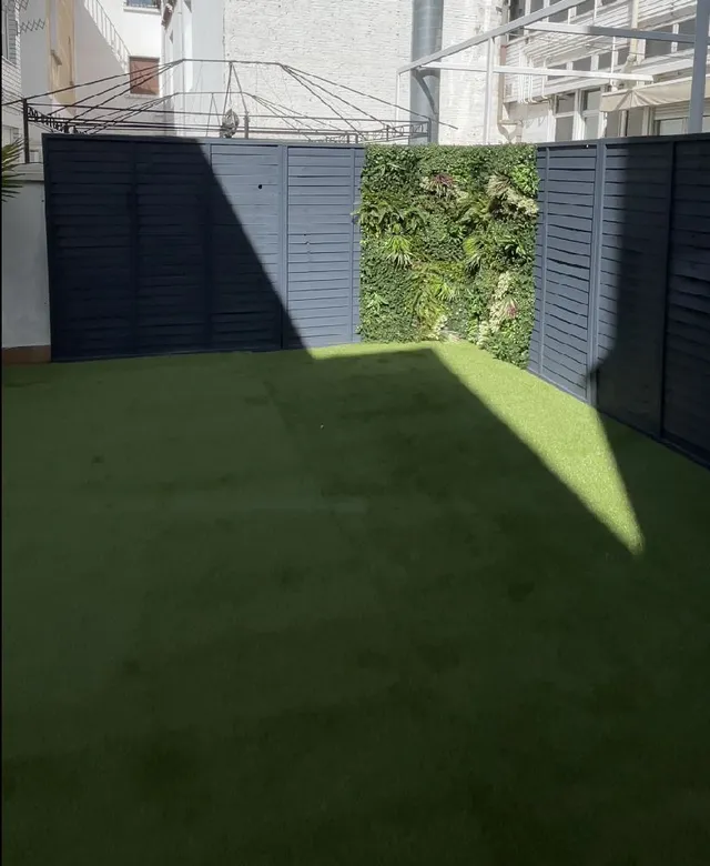 Una vez colocada toda esa zona de la pared, hemos querido ir revistiendo el suelo, para ello he utilizado un cesped artificial de la marca Tarkket, el modelo Neo, que tiene una capacidad de drenaje de 120 litros/hora, y ademas tiene 28mm de espesor, resultando super mullido y cómodo.