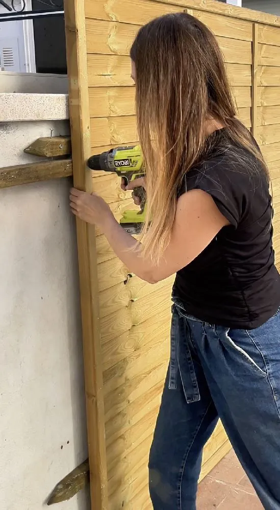 Una vez colocados los paneles, se podrian haber dejado tal cual , con la madera al natural, ya que viene con un tratamiento especicifico para exterior, pero en mi caso me apetecia aportar un toque de color, un gris antracita, por lo que utilice para pintura, esmalte al agua eco de titanlux, que es especifica para uso tanto interior como exterior.