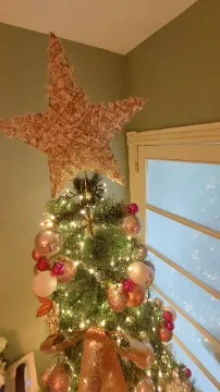He hecho grupos de bolas de distintos colores rosas respetando la paleta atadas con hilo plateado, luego para darle iluminación he puesto bolas blancas y otras color perla, y para darle elementos con volumen he añadido unos lazos grandes de color cobre rosado y para finalizar una estrella grande de cuerda de esparto. La iluminación es de led amarilla cálida colocadas en espiral de abajo a arriba.