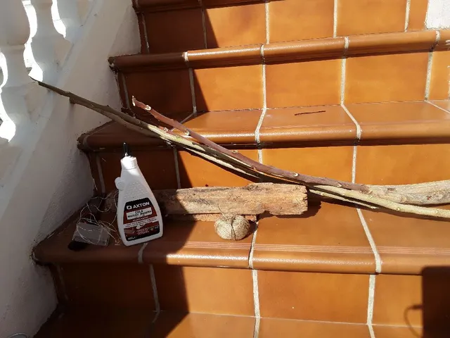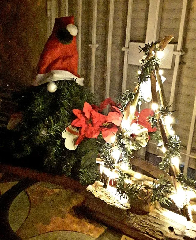Con ramas de poda de mi jardin,unos restos de cuerda de yute ,un trozo de pale que llevaba mucho tiempo al aire libre,unas ramas de pino que corte y una guirnalda led he decorado la mesa de mi terraza;el duende esta hecho con un trozo de arbol artificial que recogi de la calle,el sombrero ya lo tenia y las manoplas son de goma eva pintadas y pRa completardos pascuelos para darle color Me gusta este rincon ,con material reciclado,salvo la cola blanca ,la cuerda y las luces que son de Leroy Merlin.