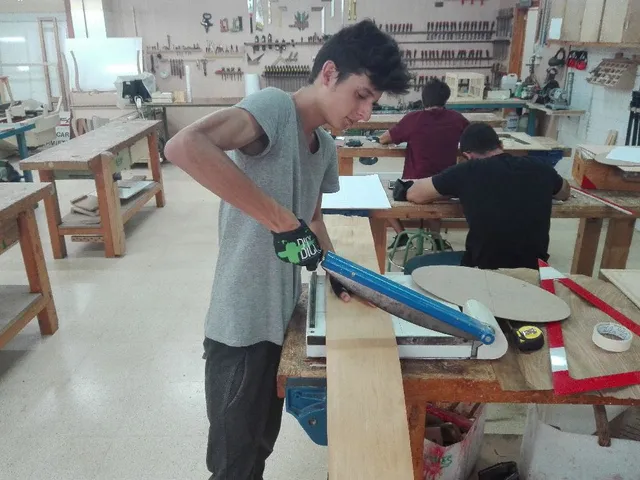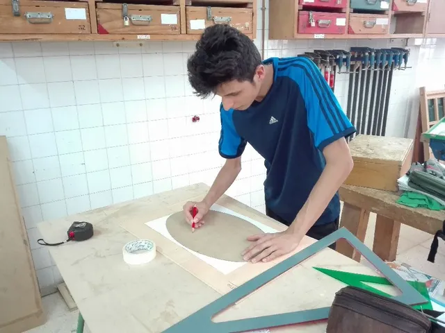 Una vez que las tiras están listas, se marcan a lápiz las siluetas de los costados y frontales en las tiras de madera y se corta sin tocar la marca de lápiz el sobrante de madera. Luego, se limpia con lima y escofina las siluetas y se hacen 5 agujeros en los frontales de: 2 de 6, 2 de 18, y se hacen 2 agujeros de 15 de diámetro en el centro de los costados a una distancia de 50 entre ellos.