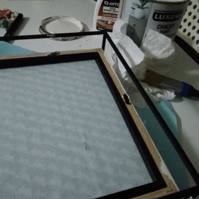 Materiales que vamos a necesitar: marco, tela, pintura chalk, brocha, tijeras.