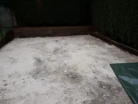 Para este proyecto, usamos como maquinaria una retroexcavadora, rodillo nivelador, un rastrillo, una pala y un soplador. Primero se removió la tierra, porque además de estar en cuesta, había un drenaje anterior que se quitó, sé retiro mucha tierra y se nivelo el terreno. Se cubre con arena de sílice para facilitar el drenaje, se aplana y se cubre con malla anti-hierba, para que no salgan malas hierbas. Posteriormente se coloca el césped artificial, cerrando alrededor con vigas antiguas de tren, y rellenando la zona de los setos con grava volcánica.