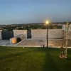 Decidimos acondicionar un bancal del jardín en el que habíamos plantado recientemente unos árboles para convertirlo en una zona “chill out” para sentarnos, leer y relajarnos con amigos o en familia. La idea fue crear un espacio central para poder colocar unos sofás de exterior alrededor de un brasero y dejar el resto del bancal cubierto por césped artificial bordeado por más plantas. Comenzamos delimitando la zona donde íbamos a poner los sofás y construyendo una base de hormigón en forma de “L” para tener un firme estable sobre el que poner un suelo de exterior de madera. Delimitados adyacente a esta base un espacio de forma cuadrada para colocar el brasero con borduras metálicas. El perímetro del bancal adyacente a muros se delimitó también, esta vez con una bordura de cemento preformada, con el fin de dejar ese espacio en tierra y poder plantar arbustos y trepadoras. Con esto construido, el resto de espacio se niveló con arena para poder colocar el césped artificial. Se colocó césped de 30mm, adaptándolo a la forma del espacio que nos restaba por acondicionar y a los árboles que ya había plantados. Ya sólo nos queda plantar algún árbol más, comprar los muebles de exterior y decorar la zona del brasero con grava blanca y la de los parterres con corteza de pino.