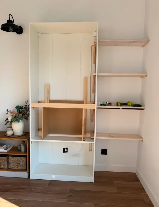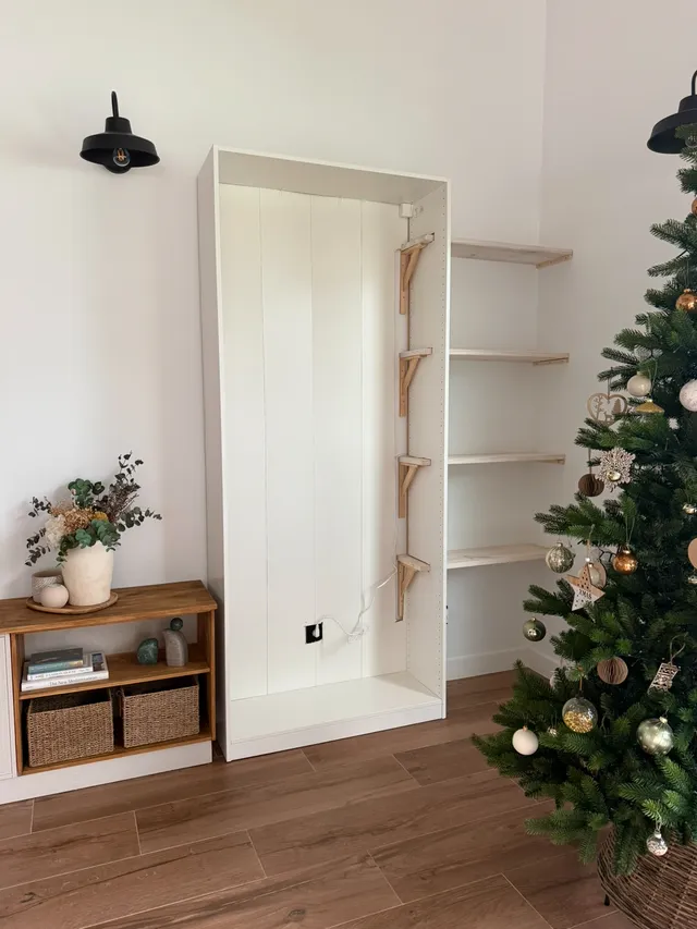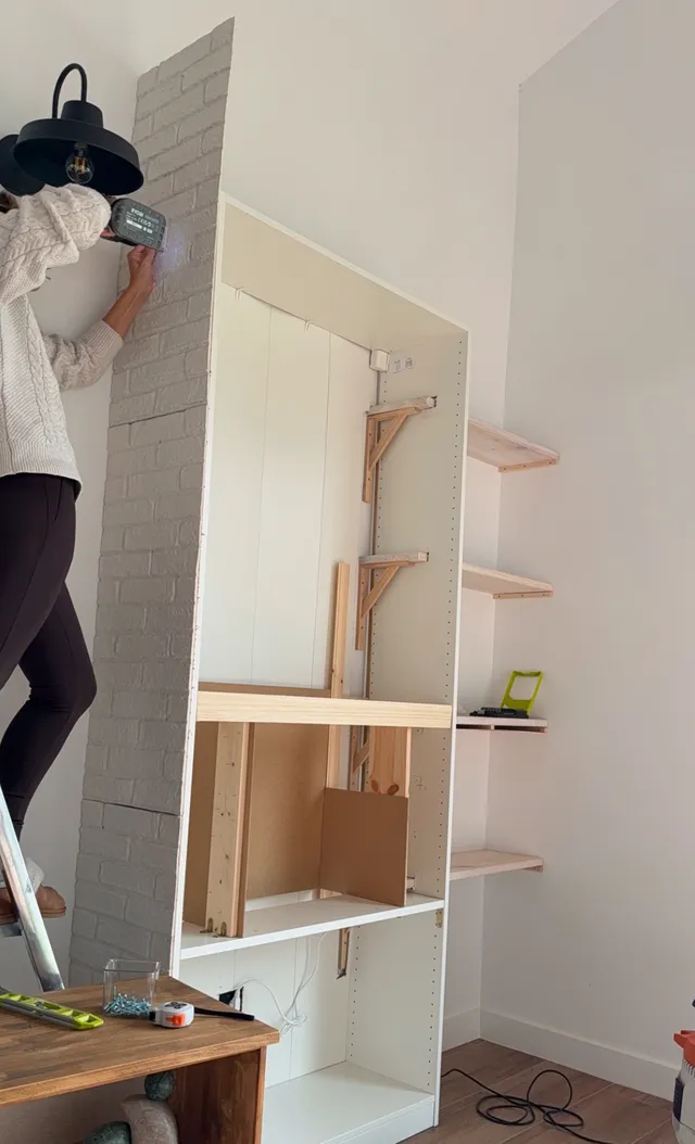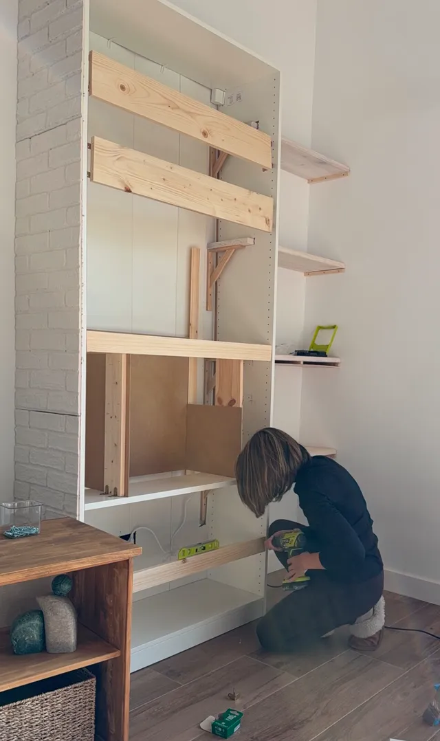 Al final del proyecto vereis que al ginal no se ve ninguno de los soportes de las baldas. Asi queda todo muy sujeto y integrado. Ahora vamos con la chimenea, Lo primero es hacer una estructura para lo que es la chimenea en si. Asi que vamos poniendo los soportes y preparando el cubo.