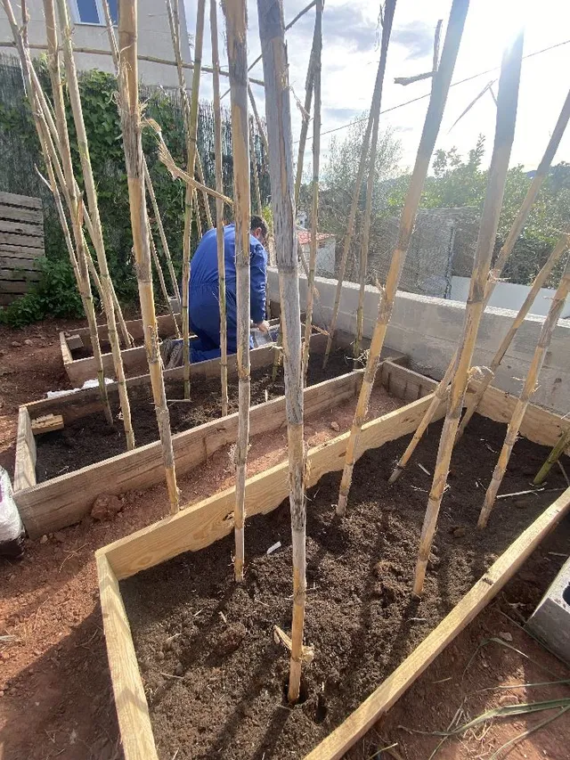 Con el terreno nivelado, hemos delimitado las zonas de siembra con listones de madera, sujetos también con varillas corrugadas. Asi creamos pequeños pasillos que nos permitan pasar entre filas de plantas.