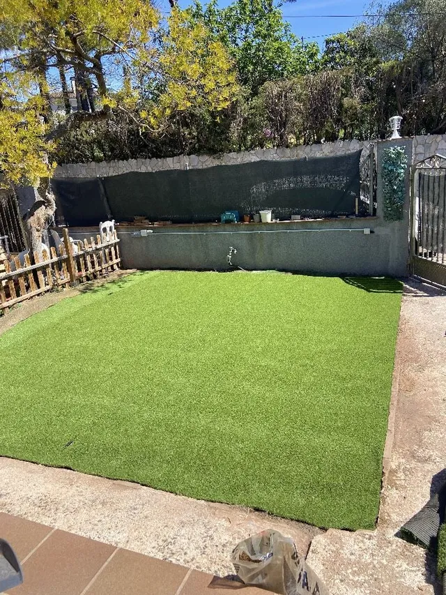 Al empezar la sequía, el césped se secó y nos quedamos con el terreno completamente desértico. Recurrimos a un césped económico, pero era de bastante mala calidad. Así que lo usamos como malla antihierbas e instalamos el nuevo encima. Nosotros elegimos el modelo Zante.