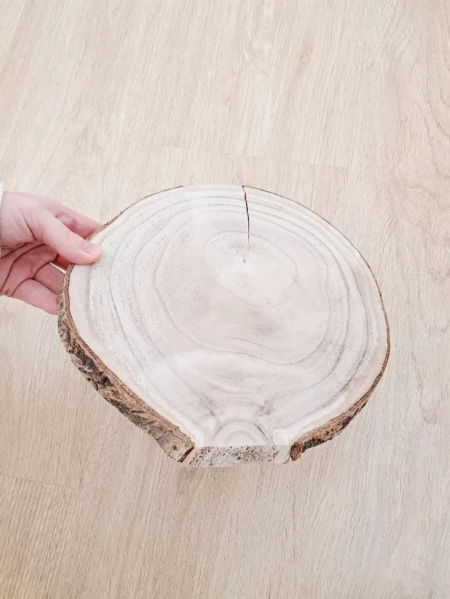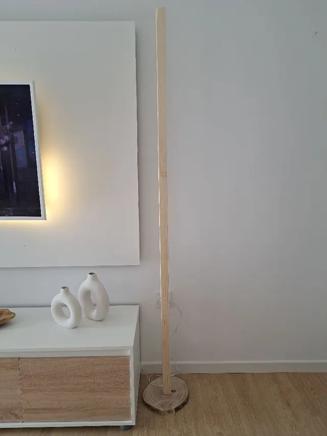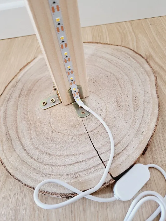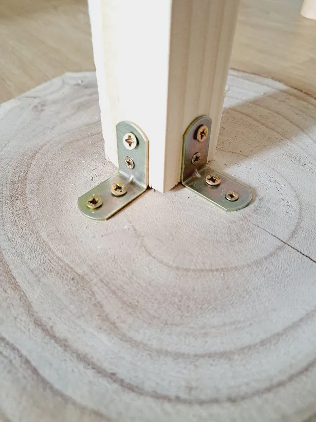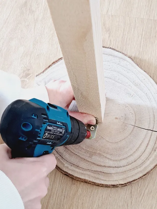 Una vez cortado a la medida deseada, utilizaremos como base para nuestra lámpara un tronco de madera que uniremos al listón con un par de escuadras de ángulo.