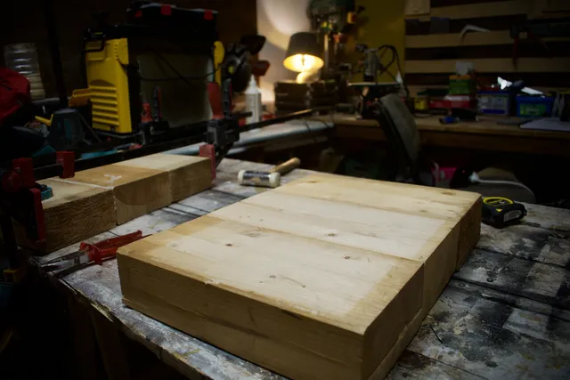 lo primero con los sobrantes de otro proyectos lo fui cortando a 34 cm de ahi con un poquito cola los fui uniendo hasta hacer un bloque de 3 que serian mis patas de la mesa para que pegue bien lo sujete con unos sargentos. Despues le deje secar un dia entero.