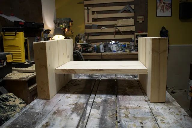 mientras que secaba corte un tablero macizo de 20 centimetros a unos 54 centimetros asi seria el largo 54cm por 20cm de ancho , de ahi lo uni con espigas a las dos patas que hice y cola de carpintero asi tendria hecho el bloque de la estructura.