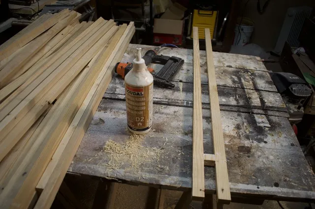 Lo siguiente era cortar taco de 2,5 cm para unir los listones, para ello cada listón coloque dos taco a unos 11 mm el primero y el segundo a 67 de distancia, para unirlo con cola y clavos.