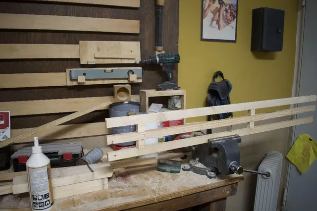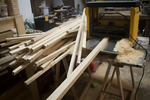 Lo primero empece cortando unos listones a 112 cm de largo donde es el ancho de mi tablero, después esos listones los cortes en pequeñas tiras de 3cm así hasta tener unas 80 tiras una vez que hice las 80 tiras lo siguiente era pasarlo por la regruesadora, así quedaba todo bien fino en las 4 caras.