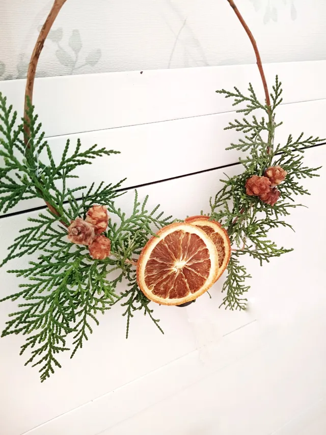 A continuación, vamos decorado la mitad de la corona con las ramas, las piñas y las naranjas, tal y como se muestra en las imágenes. ⬇️