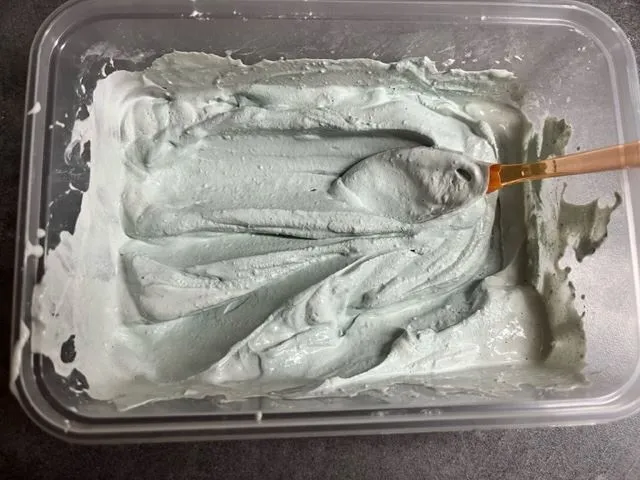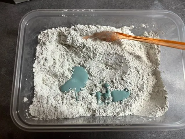 Lo primero de todo para nuestra seguridad, nos equipamos con mascarilla y guantes. Tenemos que poner 200gr de cemento en un bol, añadimos un poco de pintura hasta que obtengamos el color deseado y vamos añadiendo agua hasta que formemos una pasta consistente mezclandolo todo con la espátula.