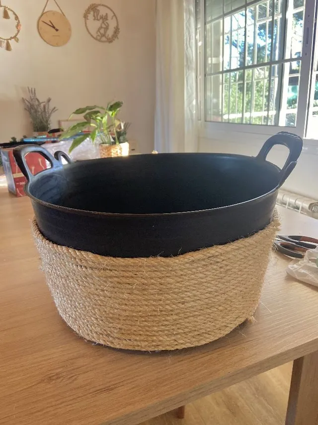 Solo necesitamos un capazo, cuerda de yute y una pistola de silicona.